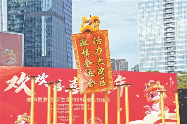 宝安在春节假期举办多场市民游客喜闻乐见的文旅活动,十五运和残特奥会的多项元素也融入其中,面向市民广泛宣传。大年初一,在海滨广场举行的“瑞狮贺岁·妙手生花”的新春系列活动中,具有宝安特色的醒狮巡游表演,还将“激情全运会,活力大湾区”的条幅展现在众多市民面前,与浓郁的节日氛围全面融合。